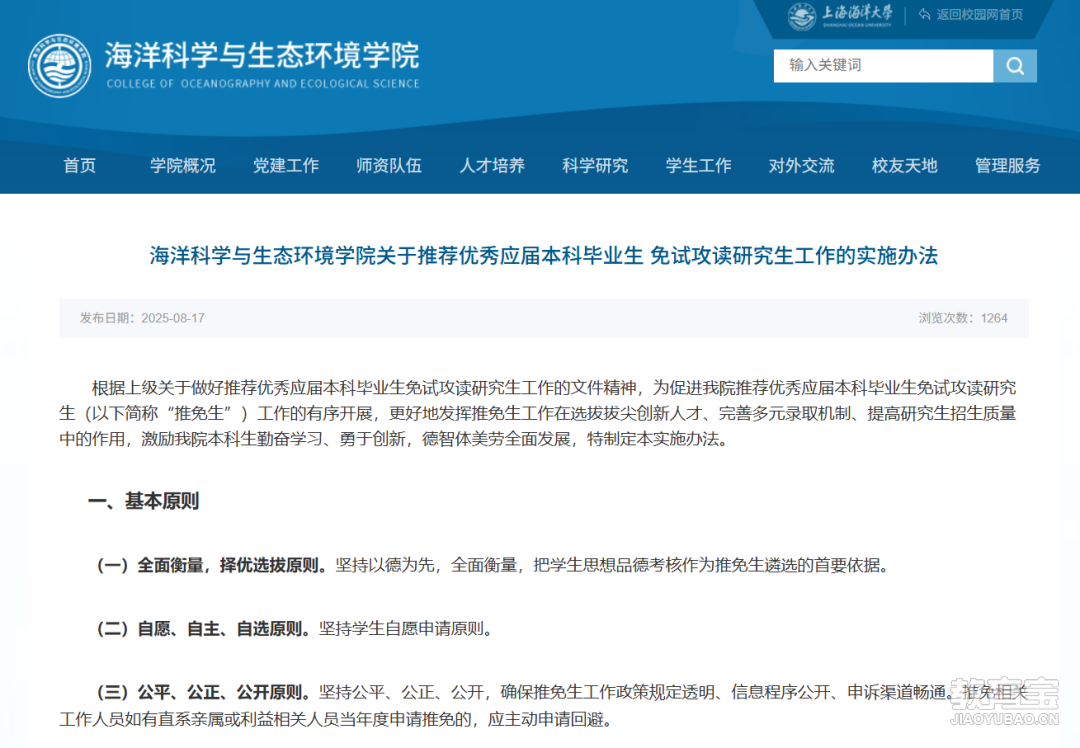 2025年9月,上海海洋大学各学院发布了2026年推荐优秀应届本科毕业生免试攻读研究生的相关通知。