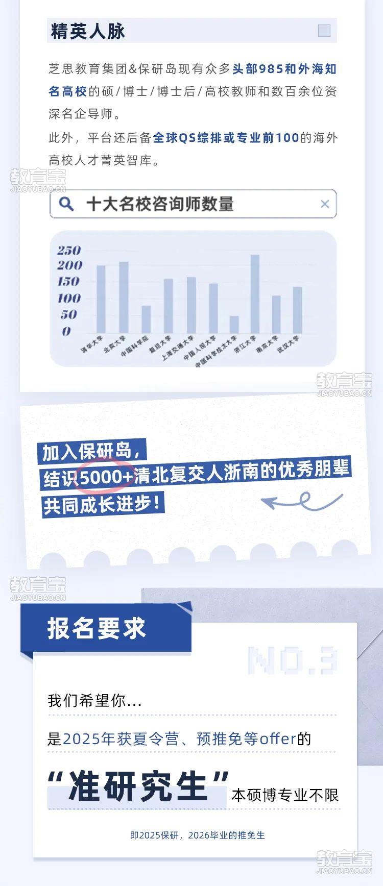 保研岛自创立以来,累计为上万名学员提供过研究生升学、背景提升服务,认证入驻的学校名企导师达15000余位。未来,我们将继续以高标准、高效率、高精度的企业精神,为每一位怀揣梦想的学子,提供*真挚、*温暖的服务。从政策解读到院校选择,从材料准备到面试辅导,让每一个保研er都能少走一点弯路,多一份从容与自信。“如果你也想在帮助他人实现梦想的同时书写自己的精彩篇章,那么诚心欢迎你加入我们,和我们一起用专业和热情,为更多的保研er出谋划策、规避风险,也为自己博一份精彩人生!”心动不如行动赶紧扫描下方二维码进行报名吧!