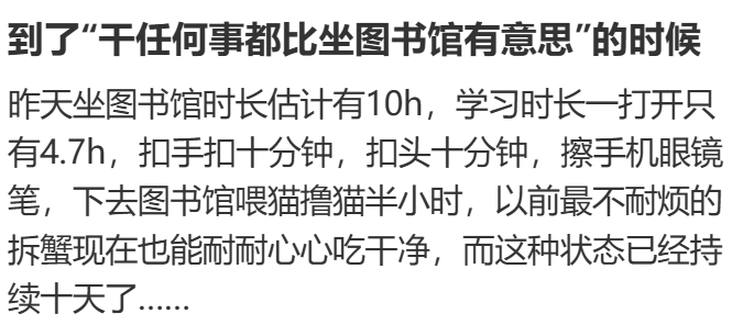 (图源:网络)?? 以前不喜欢干的,现在都是真香你会突然意识到:扣手指缝?治愈。喂猫?快乐。整理袜子?有成就感。拆螃蟹?堪比过节!学习一分钟,休息一小时。你甚至能被阳光照到桌子的角落感动一整天。
