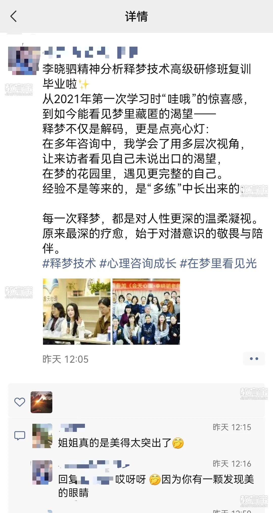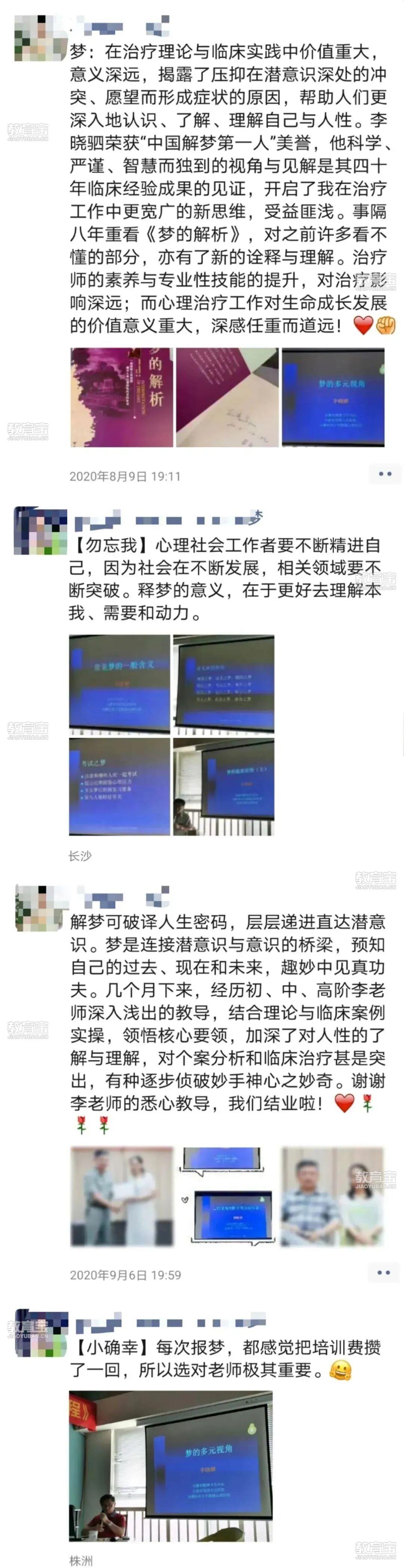 作为行业大咖,李晓驷教授不讲空泛的理论,而是把自己近40年经验,拆解成你直接能用的心法。1. 教你快速抓住梦境中的关键意象,比如飞翔、坠落、数字、考试、裸露背后的不同隐喻。2. 带你通过真实梦境练习抽丝剥茧,比如,如何从梦者随口说的词语看透未说出的秘密;面对毫无意义或模糊不清的梦,如何打破常规则、另辟蹊径等。3. 大量现场案例督导,帮你避开解读偏差的坑,从多个维度理解来访者梦境背后的欲望与需求,让咨询工作更加有效。总之,课程涉及大量真实个案隐私,无法逐一描述,只能等你亲自体验,就像学员说的:“每次报梦,都感觉把培训费赚了回来!”还有学员反馈:“想系统学释梦,跟着李晓驷老师是,6 天就能摸到核心,比自己摸索节省好几年时间!”真的很难用文字来形容课程的精彩,可以看看我们的收获。