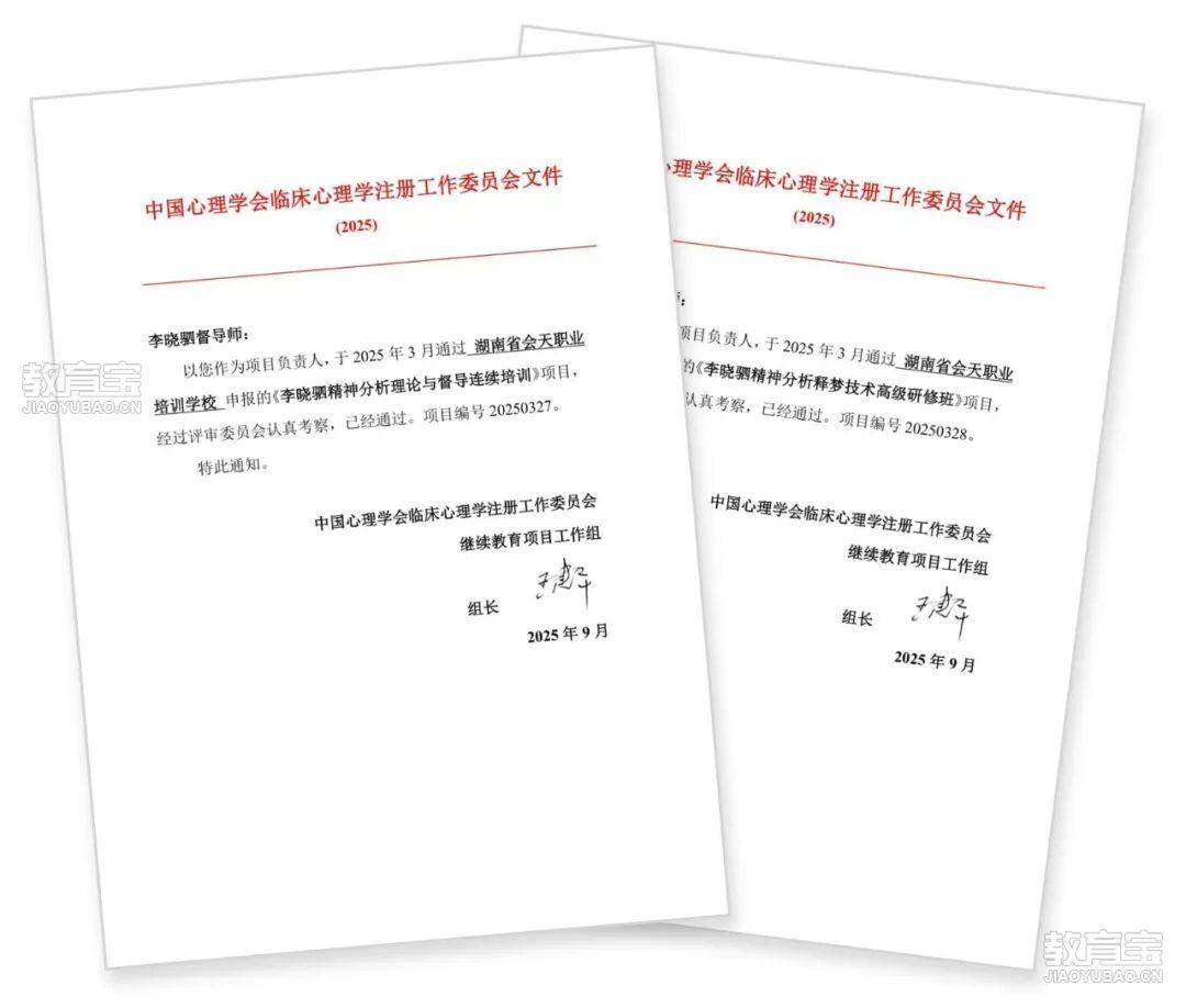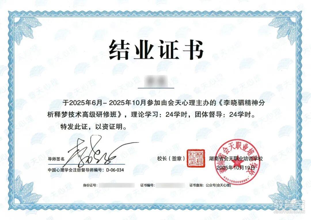 3. 行业权威认可证书,助力咨询事业发展与个人成长完成理论学习与案例督导,且出勤率≥90%,你可获得由李晓驷老师与会天心理联合签发的《李晓驷精神分析释梦技术高级研修班》证书(理论学习24学时、团体督导24学时),可用于作为中国心理学会注册系统学时证明。