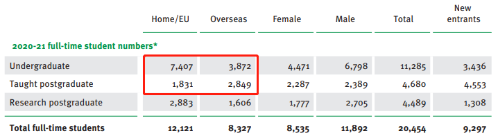 国际学生比例:2020-2021年度,本科生有7407名学生来自英国/欧盟国家,非欧盟国家留学生为3872人,来自非欧盟国的留学生大约占总人数的34%。授课型硕士有1831名学生来自英国/欧盟国家,非欧盟国家留学生为2849人,来自非欧盟国的留学生大约占总人数的61%。