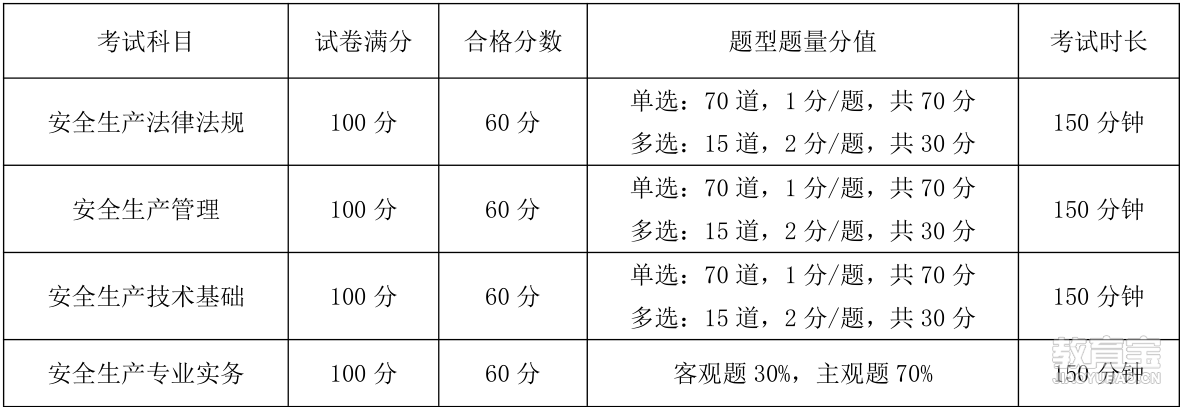 安全工程师考试一共四个科目,安全生产法律法规单,安全生产管理,安全生产技术基础,安全生产专业实务,其中,安全生产法律法规单,安全生产管理,安全生产技术基础为公共科目,满分100分,60分及格,考试题型均为单选:70 道,1 分/题,共 70 分;多选:15 道,2 分/题,共 30 分。安全生产专业实务 客观题30分,主观题70分,各科考试时间均为150分钟。