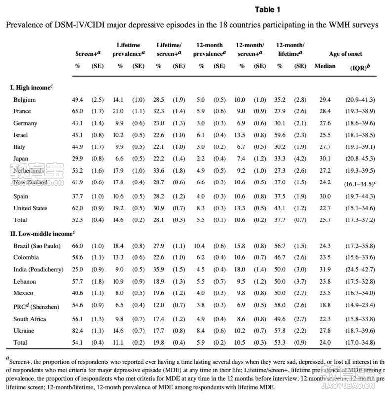 另一份来自WHO的流调报告显示: 国家发展水平不同,心理/精神疾病的发病率也会相应 地 增加(特别是终身发病率 。 从报告中我们不难发现,高收入国家的终身发病率高于低收入国家的终身发病率,但是过去 12 个月的发病率并不存在显著的差距。