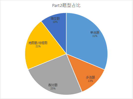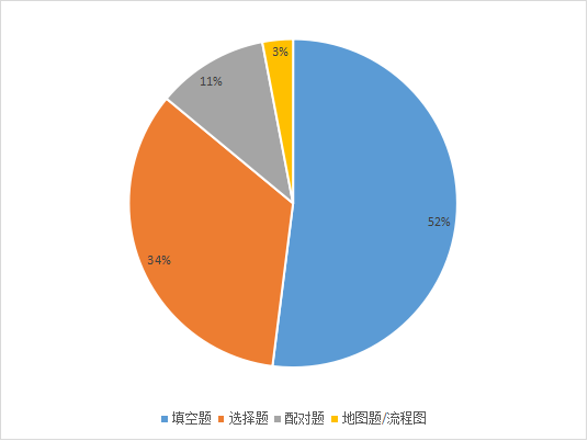 总体来看,填空类题型相较于选择类题型在数值占比方面稍有提升,达到了52%。居于第二的题型类别是选择类题型(包括单选题、多选题),占比34%,配对题仍然保持在第三的位置上,没有太大变动,占比11%。对于考试中考频较低的地图题在这期间的考试中出现过十次,平均每三场考试就会有一场出现地图题,因此,学生在备考中还需要重视练习。虽然流程图只出现过一次,但仍不可掉以轻心。