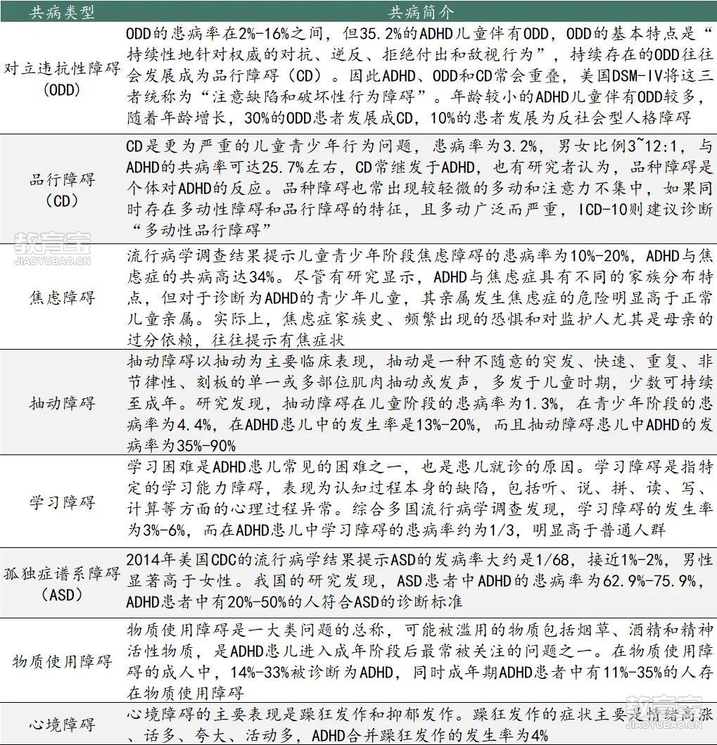 (图自百度文库—药尊者学术库,内容译自2011 ACCF/AHA Guideline for the Diagnosis and Treatment of Hypertrophic Cardiomyopathy ) ③多动症治疗服务供给不足 目前,有关多动症的临床医生稀缺,因此,当儿童在进行专科医生的诊治时,他们所得到的治疗服务是不足的。 儿童多动症患病人数众多,全球儿童发病率约为7.2%,60%-80%可持续至青少年期,50.9%持续为成人ADHD,并且约65%的患儿存在一种或多种共患病。 研究发现,ADHD患儿的共病比例高、种类多,有文献报告 ADHD患儿共患率高 。 在儿童青少年阶段常见的共患疾病依次为破坏性行为障碍、学习障碍、抽动障碍、情绪问题或心境障碍等;在成人阶段,常见的共患疾病包括反社会型人格障碍、物质使用障碍、情感障碍等。