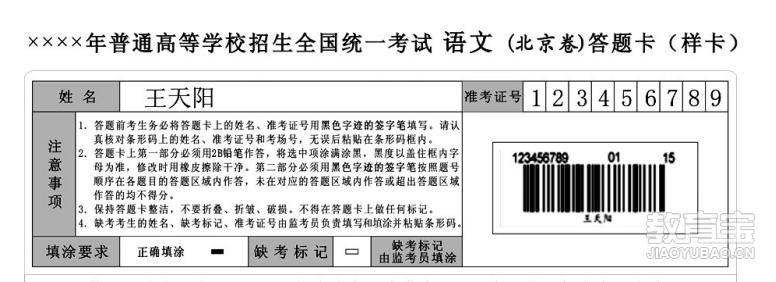 ▶ 考生进入考场后,按座位号对号入座,将身份证和准考证放在桌子右上角以便核验。考生领到答题卡后,应按要求在规定的时间内在答题卡上的指定位置准确、清楚地填写姓名、准考证号,并在监考员的指导下正确粘贴个人信息条形码。凡漏填、错填或书写字迹不清的答卷,影响评卷结果的,责任由考生自负。 遇试卷、答题卡分发错误及试题字迹不清、重印、漏印或缺页等问题,可举手询问,须在开考前报告监考员,开考后不再更换;涉及试题内容的疑问,不得向监考员询问。 所有考试材料均须放置在桌面上。