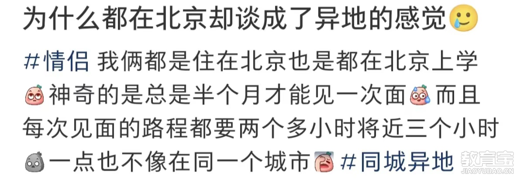 说直观点, 如果远在奉贤的学子想去趟市中心,得转一班公交和三趟地铁,来回一趟要四个小时 ,一路上能坐得眼冒金星。 可在北京有些郊外校区的大学生眼里,上海这些高校的距离估计都不过如此。 作为中国总面积*大的一线城市,北京三环内寸土寸金,以至于各个高校的校区随机散落在那些远离市中心的地方。 有的情侣在填志愿的时候,约定好一起奔赴北京,结果到了学校才发现, 同城见面远比京津异地还要难得多。