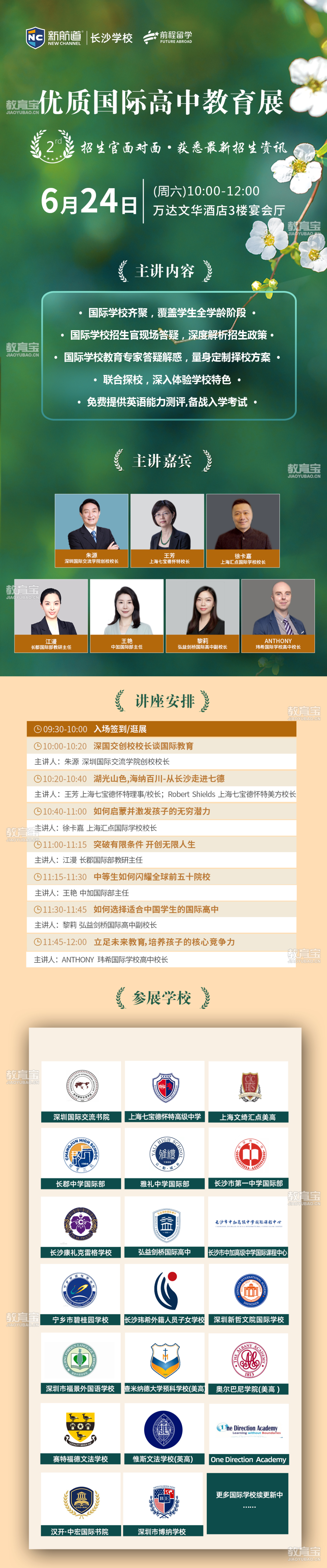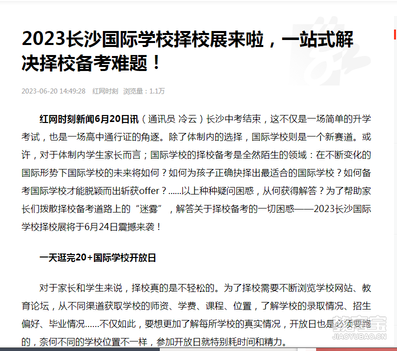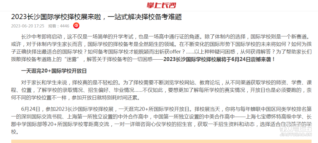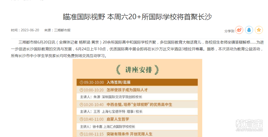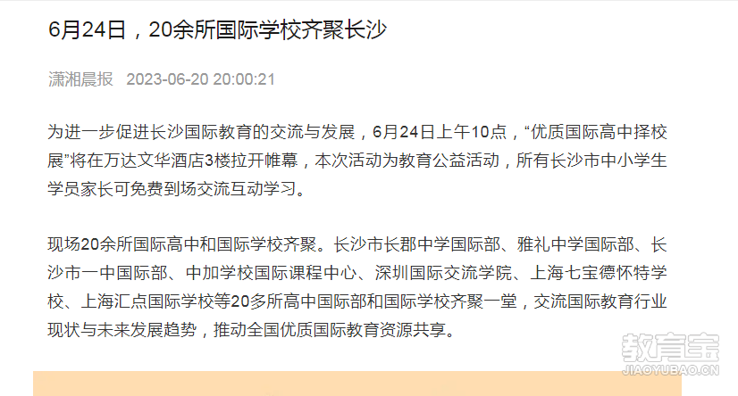 免费领取各国留学资料包 6月24日(本周六)10:00 ,优质国际高中教育展·长沙站强势来袭! 本次教育展旨在为初升高的学生与家长拨散“迷雾”,解答疑惑,帮助他们准 确抉择出*适合的学校。 潇湘晨报、 湖南红网、 三湘都市报、掌上长沙 潇湘晨报 为进一步促进长沙国际教育的交流与发展,6月24日上午1...